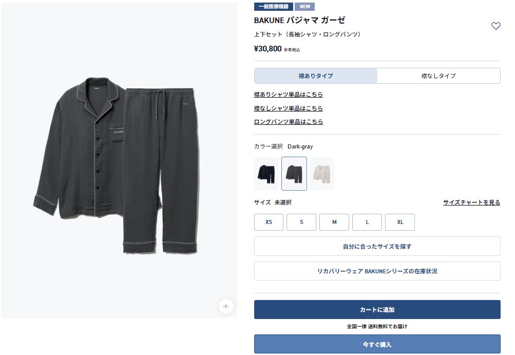 初めての方には定番の「BAKUNEスウェット」、寒がりの方には裏起毛の「BAKUNEウォーム」や「BAKUNEベロア」、敏感肌の方には「BAKUNEパジャマ ガーゼ」がおすすめです。
