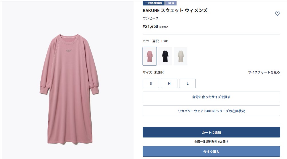 冬用BAKUNEは素材やデザインによって価格も様々です。リーズナブルな「BAKUNEスウェット ウィメンズ ワンピース」が21,450円、最も高額な「BAKUNEパジャマ サテン」が38,940円と、約17,000円の価格差があります。