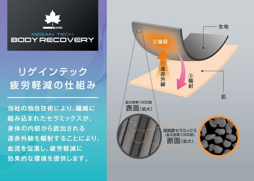体温による遠赤外線を輻射して血流を促進し、筋肉のハリ・コリをほぐします。着るだけで疲労回復をサポートし、洗濯を繰り返しても効果が持続します。